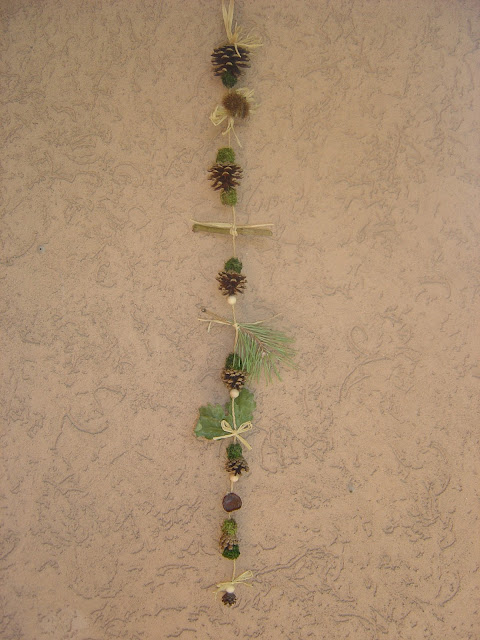2) Ho legato con un po' di rafia e colla a caldo tutto ciò che avevo trovato nel bosco: un riccio vuoto, un rametto, aghi di pino, foglie di quercia.